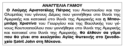 Αναγγελία Γάμου Λούμη Αριστοτέλη και Μπουμπάρη Χριστίνας Κείμενο Βλέπε εικόνα Αριθμός Φύλλου: 5144 Κατηγορία: Αναγγελία Γάμου