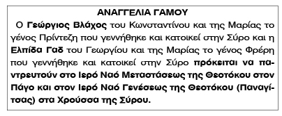Αναγγελία γάμου Γεώργιου Βλάχου και Ελπίδας Γαδ Κείμενο Βλέπε εικόνα Αριθμός Φύλλου: 5146 Κατηγορία: Αναγγελία Γάμου