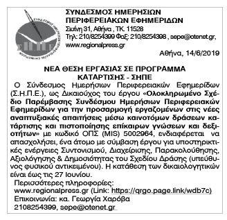 Νέα θέση εργασίας σε πρόγραμμα κατάρτισης - ΣΗΠΕ Κείμενο Βλέπε εικόνα Αριθμός Φύλλου: 5148 Κατηγορία: Προκήρυξη Θέσεων