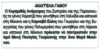 Αναγγελία Γάμου Κεραμιδά Ανάργυρου και Καρναβά Ελένης Κείμενο Βλέπε εικόνα Αριθμός Φύλλου: 5153 Κατηγορία: Αναγγελία Γάμου