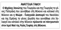 Αναγγελία γάμου Χανιώτη Μιχάλη και Δασουρά Φλώρας Ευαγγελίας Κείμενο Βλέπε εικόνα Αριθμός Φύλλου: 5161 Κατηγορία: Αναγγελία Γάμου