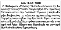 Αναγγελία γάμου Ελπιδοφόρου Χρήστου Γαδ και Μαρίας Ειρήνης Βαμβακούση Κείμενο Βλέπε εικόνα Αριθμός Φύλλου: 5161 Κατηγορία: Αναγγελία Γάμου