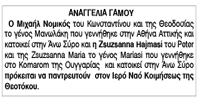 Αναγγελία γάμου Μιχαήλ Νομικού και Zsuzsanna Hanmasi Κείμενο Βλέπε εικόνα Αριθμός Φύλλου: 5162 Κατηγορία: Αναγγελία Γάμου