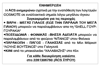 Ενημέρωση της ACS COURIER σχετικά με την εναπόθεση των λογαριασμών της COSMOTE Κείμενο Βλέπε εικόνα Αριθμός Φύλλου: 5163 Κατηγορία: Ανακοίνωση