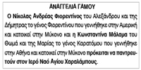 Αναγγελία γάμου Νίκολα Ανδρέα Φιορεντίνου και Κωνσταντίνας Μάλαμα Κείμενο Βλέπε εικόνα Αριθμός Φύλλου: 5166 Κατηγορία: Αναγγελία Γάμου