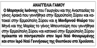 Αναγγελία γάμου Μαραγκού Ιωάννη και Μενδρινού Φλώρας Κείμενο Βλέπε εικόνα Αριθμός Φύλλου: 5169 Κατηγορία: Αναγγελία Γάμου