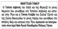 Αναγγελία γάμου Τσίτσα Λάβντος και Τσίτσα Ετλέβα Κείμενο Βλέπε εικόνα Αριθμός Φύλλου: 5172 Κατηγορία: Αναγγελία Γάμου