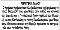 Αναγγελία γάμου Χρήστου Χρήστου και Τριανταφυλλιάς Πνευματικού Κείμενο Βλέπε εικόνα Αριθμός Φύλλου: 5174 Κατηγορία: Αναγγελία Γάμου