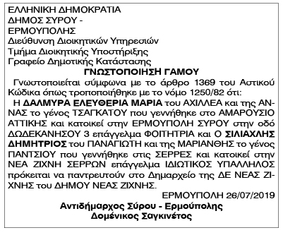 Γνωστοποίηση γάμου Δαλμυρά Ελευθερία Μαρία και Σιλιαχλή Δημητρίου Κείμενο Βλέπε εικόνα Αριθμός Φύλλου: 5177 Κατηγορία: Γνωστοποίηση Γάμου