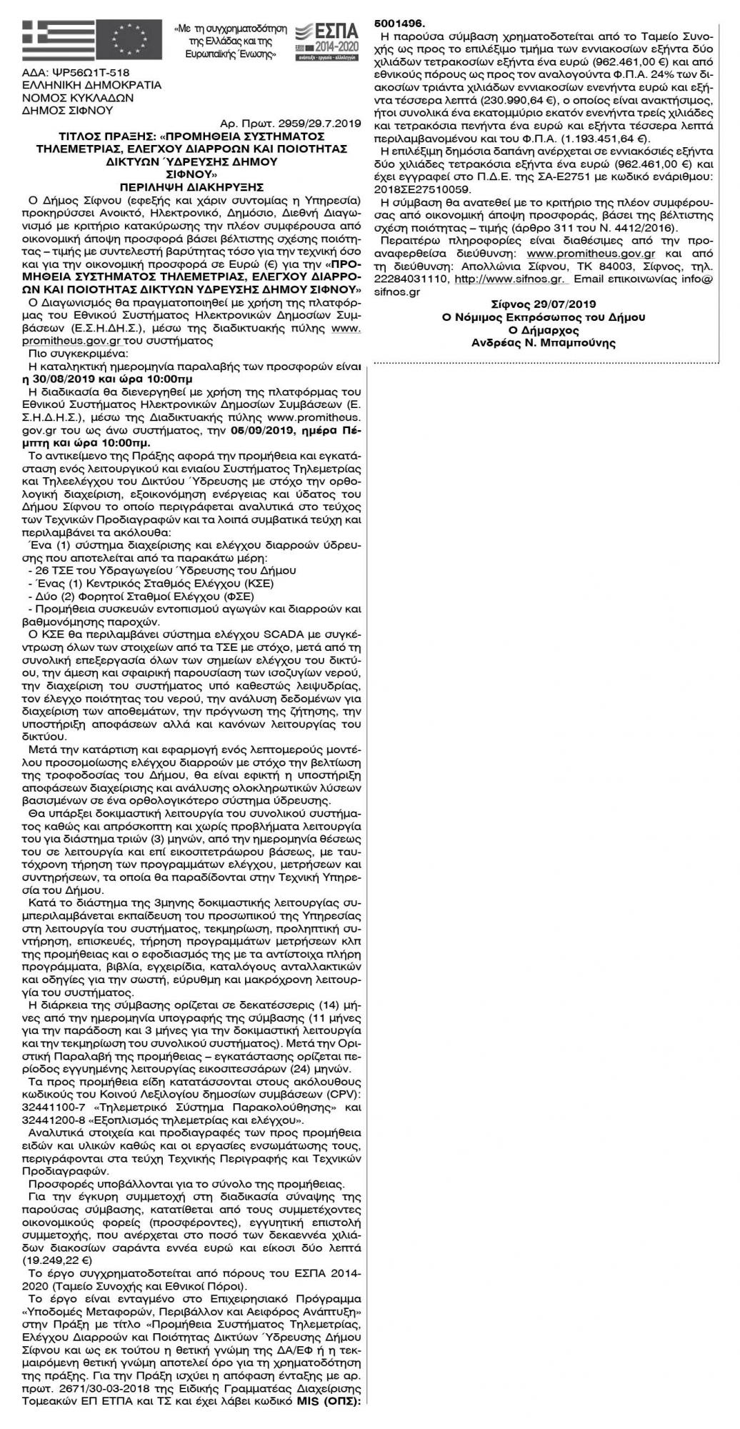 Προμήθεια συστήματος τηλεμετρίας, ελέγχου διαρροών και ποιότητας δικτύων ύδρευσης Δήμου Σίφνου