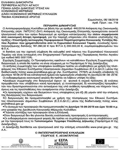 Υποστήριξη λειτουργίας Περιφερειακού Παρατηρητηρίου Κοινωνικής Ένταξης Νοτίου Αιγαίου Κείμενο Βλέπε εικόνα Αριθμός Φύλλου: 5184 Κατηγορία: Προκήρυξη Έργων - Δημοπρασίες