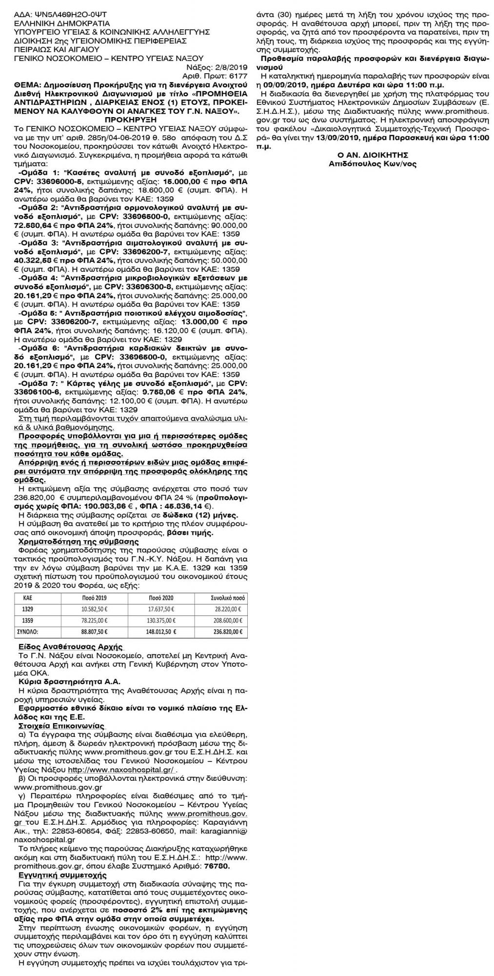 Προμήθεια αντιδραστηρίων διάρκειας ενός έτους προκειμένου να καλυφθούν οι ανάγκες του Γ.Ν. Νάξου Κείμενο Βλέπε εικόνα Αριθμός Φύλλου: 5186 Κατηγορία: Προκήρυξη Έργων - Δημοπρασίες