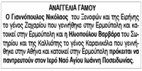 Αναγγελία γάμου Γιαννόπουλου Νικολάου και Ηλιοπούλου Βαρβάρας Κείμενο Βλέπε εικόνα Αριθμός Φύλλου: 5189 Κατηγορία: Αναγγελία Γάμου