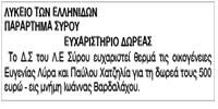 Ευχαριστήριο Δωρεάς Λυκείου Ελληνίδων Σύρου Κείμενο Βλέπε εικόνα Αριθμός Φύλλου: 5190 Κατηγορία: Ευχαριστήριο