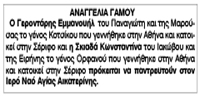 Αναγγελία Γάμου Γεροντάρη Εμμανουήλ και Σκιαδά Κωνσταντίνας Κείμενο Βλέπε εικόνα Αριθμός Φύλλου: 5193 Κατηγορία: Αναγγελία Γάμου
