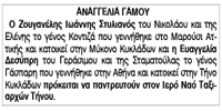 Αναγγελία γάμου Ζουγανέλη Ιωάννη-Στυλιανού και Δεσύπρη Ευαγγελίας Κείμενο Βλέπε εικόνα Αριθμός Φύλλου: 5195 Κατηγορία: Αναγγελία Γάμου