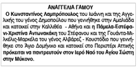 Αναγγελία γάμου Κωνσταντίνου Λαμπρόπουλου και Πάμελα Αντωνακάκη Κείμενο Βλέπε εικόνα Αριθμός Φύλλου: 5200 Κατηγορία: Αναγγελία Γάμου