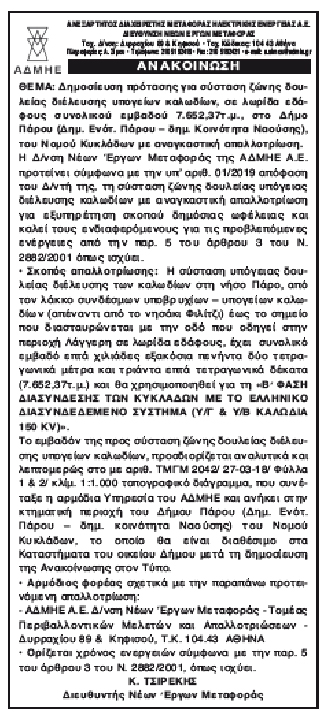 Σύσταση δουλείας διέλευσης υπογείων καλωδίων στο Δήμο Πάρου Κείμενο Βλέπε εικόνα Αριθμός Φύλλου: Αριθμός Φύλλου 5200 Κατηγορία: Κατηγορία Ανακοίνωση