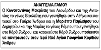 Αναγγελία γάμου Μακρίνα Κωνσταντίνου και Παρλιάρου Μαριέττας Κείμενο Βλέπε εικόνα Αριθμός Φύλλου: 5204 Κατηγορία: Αναγγελία Γάμου