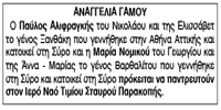 Αναγγελία Γάμου Παύλου Αλιφραγκή και Μαρίας Νομικού Κείμενο Βλέπε εικόνα Αριθμός Φύλλου: 5209 Κατηγορία: Αναγγελία Γάμου