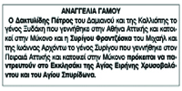 Αναγγελία Γάμου Δακτυλίδη Πέτρου και Συρίγου Φραντζέσκας Κείμενο Βλέπε εικόνα Αριθμός Φύλλου: 5213 Κατηγορία: Αναγγελία Γάμου