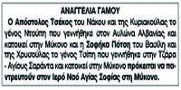 Αναγγελία γάμου Απόστολου Τσέκου και Σοφήκα Πότση Κείμενο Βλέπε εικόνα Αριθμός Φύλλου: 5214 Κατηγορία: Αναγγελία Γάμου