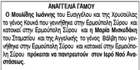 Αναγγελία γάμου Μουλίδη Ιωάννη και Μαρίας Μισκεδάκη Κείμενο Βλέπε εικόνα Αριθμός Φύλλου: 5221 Κατηγορία: Αναγγελία Γάμου