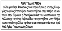 Αναγγελία γάμου Ζουγανέλη Στέφανου και Ζαννή Ανθούλα Κείμενο Βλέπε εικόνα Αριθμός Φύλλου: 5222 Κατηγορία: Αναγγελία Γάμου