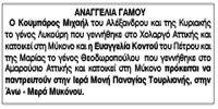 Αναγγελία γάμου Κουμπάρου Μιχαήλ και Κοντού Ευαγγελίας Κείμενο Βλέπε εικόνα Αριθμός Φύλλου: 5226 Κατηγορία: Αναγγελία Γάμου