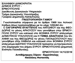 Γνωστοποίηση γάμου Ξαγοράρη Ευαγγέλου και Τζίμα Αναστασίας Κείμενο Βλέπε εικόνα Αριθμός Φύλλου: 5232 Κατηγορία: Γνωστοποίηση Γάμου
