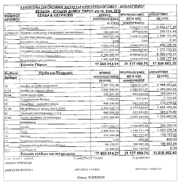 Συνοπτική Οικονομική Κατάσταση Προϋπολογισμού - Απολογισμού Εσόδων - Εξόδων Δήμου Πάρου έτους 2018 Κείμενο Βλέπε εικόνα Αριθμός Φύλλου: Αριθμός Φύλλου 5236 Κατηγορία: Κατηγορία Προϋπολογισμοί