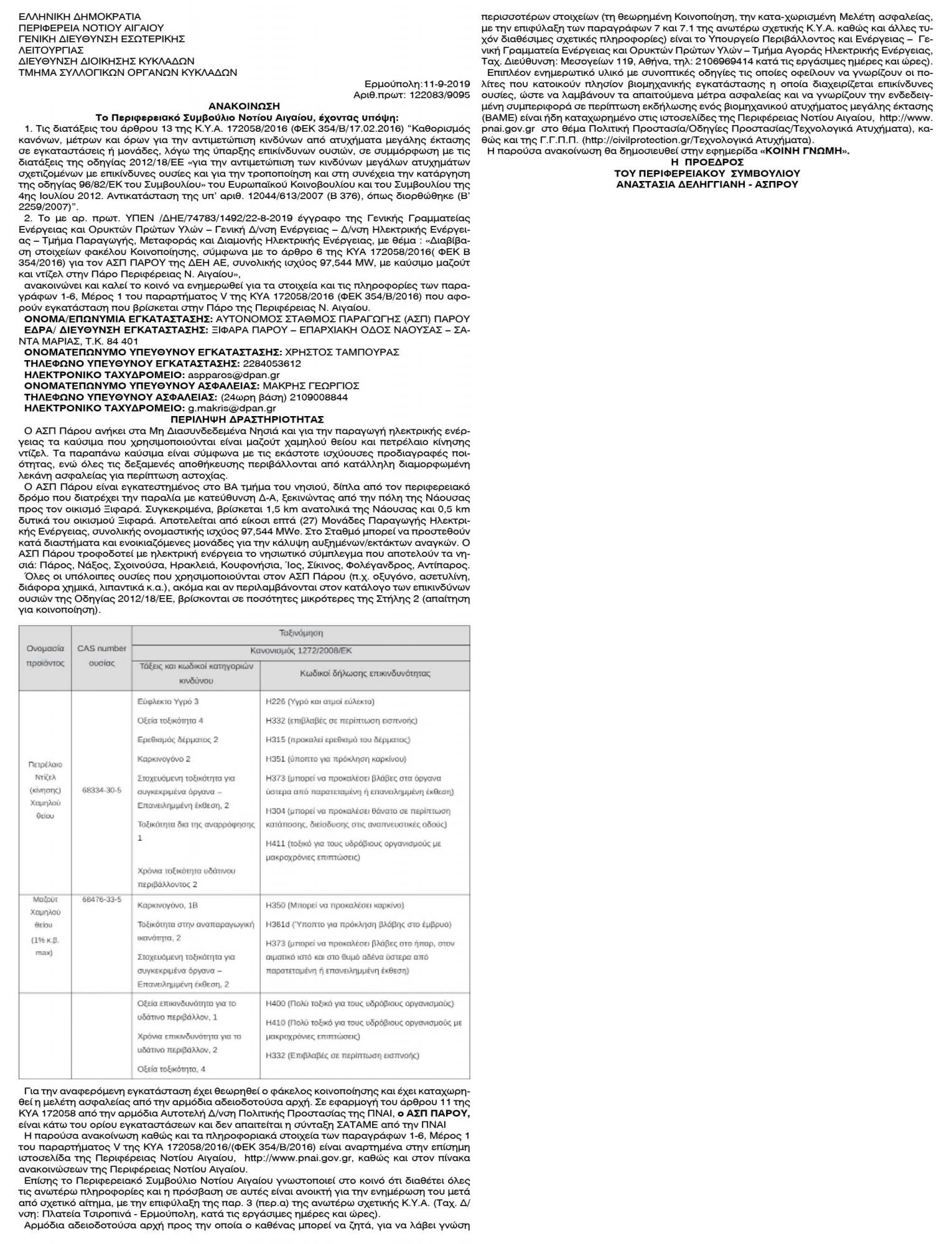 ΑΣΠ Πάρου της ΔΕΗ Α.Ε, συνολικής ισχύος με καύσιμο μαζούτ και ντίζελ στην Πάρο Κείμενο Βλέπε εικόνα Αριθμός Φύλλου: 5255 Κατηγορία: Ανακοίνωση