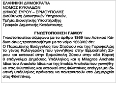 Γνωστοποίηση γάμου Παραμάνη Ευαγγέλου και Milagros Ancheta Idica Κείμενο Βλέπε εικόνα Αριθμός Φύλλου: 5265 Κατηγορία: Γνωστοποίηση Γάμου
