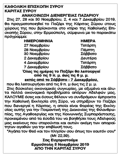 Ανακοίνωση διενέργειας παζαριού της Κάριτας Σύρου Κείμενο Βλέπε εικόνα Αριθμός Φύλλου: 5268 Κατηγορία: Ανακοίνωση