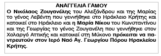 Αναγγελία Γάμου Νικολάου Ζουγανέλη και Μαρίας Νίκου Κείμενο Βλέπε εικόνα Αριθμός Φύλλου: 5269 Κατηγορία: Αναγγελία Γάμου