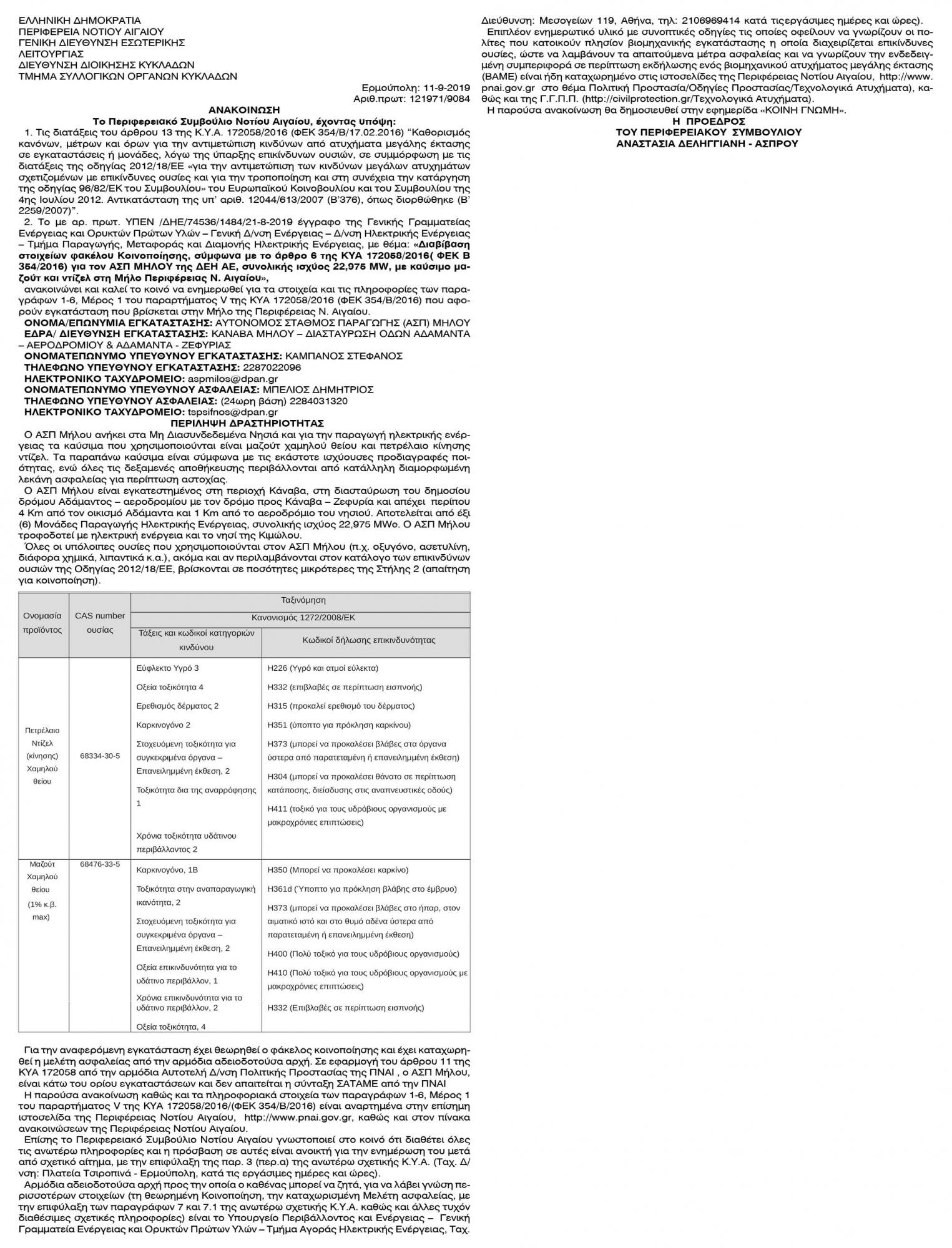 Διαβίβαση στοιχείων φακέλου κοινοποίησης για τον ΑΣΠ Μήλου της ΔΕΗ ΑΕ Κείμενο Βλέπε εικόνα Αριθμός Φύλλου: 5275 Κατηγορία: Ανακοίνωση