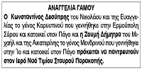 Αναγγελία Γάμου Κωνσταντίνου Δεσύπρη και Δήμηρας Ζουμή Κείμενο Βλέπε εικόνα Αριθμός Φύλλου: 5282 Κατηγορία: Αναγγελία Γάμου
