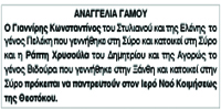 Αναγγελία Γάμου Γιαννίρη Κωνσταντίνου και Ράπτη Χρυσούλας Κείμενο Βλέπε εικόνα Αριθμός Φύλλου: 5310 Κατηγορία: Αναγγελία Γάμου