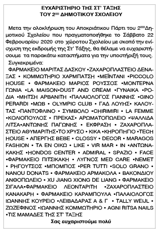 Ευχαριστήριο 2ου Δημοτικού Σχολείου Ερμούπολης Κείμενο Βλέπε εικόνα Αριθμός Φύλλου: 5321 Κατηγορία: Ευχαριστήριο