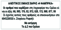 Ανακοίνωση αριθμών λαχειοφόρου αγοράς του Αλιευτικού Ομίλου Βάρης Κείμενο Βλέπε εικόνα Αριθμός Φύλλου: Αριθμός Φύλλου 5329 Κατηγορία: Κατηγορία Ανακοίνωση