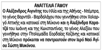 Αναγγελια γάμου Αλέξανδρου Αιγινίτη και Αλεξάνδρας Καρατζά Κείμενο Βλέπε εικόνα Αριθμός Φύλλου: 5336 Κατηγορία: Αναγγελία Γάμου