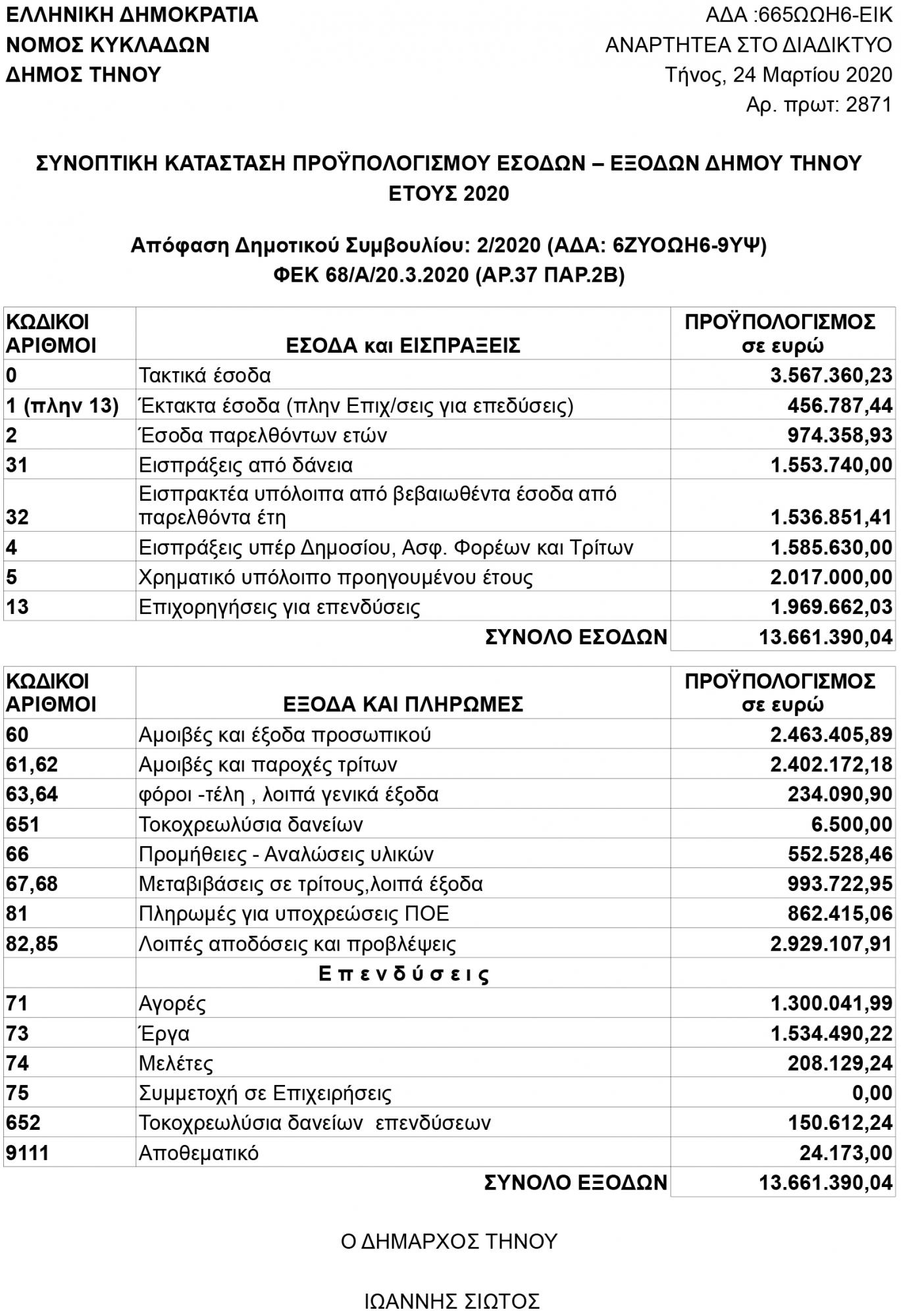 Συνοπτική Κατάσταση Προϋπολογισμού Εσόδων - Εξόδων έτους 2020 Δήμου Τήνου Κείμενο Βλέπε εικόνα Αριθμός Φύλλου: Αριθμός Φύλλου 5342 Κατηγορία: Κατηγορία Προϋπολογισμοί