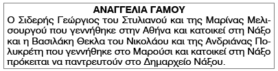 Αναγγελία Γάμου Σιδερή Γεωργίου και Βασιλάκη Θέκλας Κείμενο Βλέπε εικόνα Αριθμός Φύλλου: 5342 Κατηγορία: Αναγγελία Γάμου