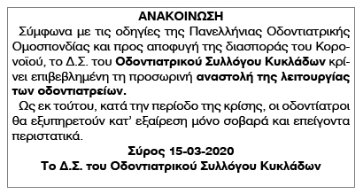 Ανακοίνωση Οδοντιατρικού Συλλόγου Κυκλάδων Κείμενο Βλέπε εικόνα Αριθμός Φύλλου: 5344 Κατηγορία: Ανακοίνωση