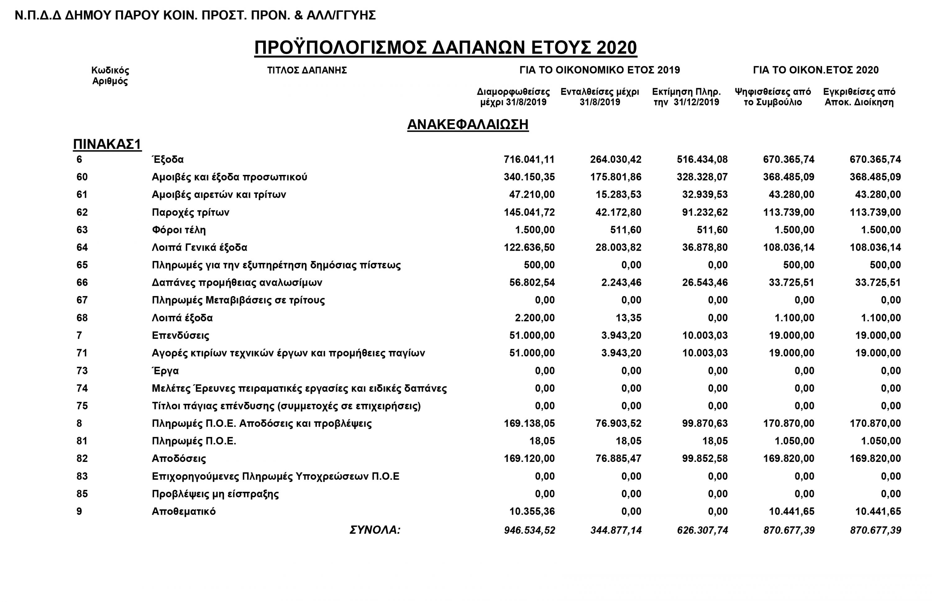 Προϋπολογισμός Δαπανών έτους 2020 του Ν.Π.Δ.Δ.Κ.Π.Π.Α Δήμου Πάρου Κείμενο Βλέπε εικόνα Αριθμός Φύλλου: 5347 Κατηγορία: Προϋπολογισμοί