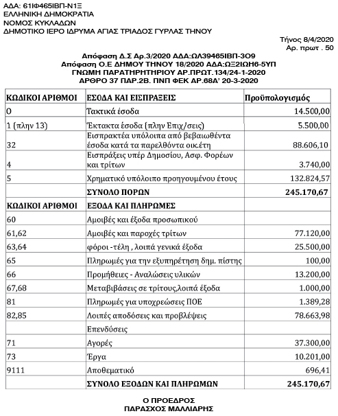 Συνοπτική Κατάσταση Προϋπολογισμού έτους 2020 του Δημοτικού Ιδρύματος Αγίας Τριάδας Γύρλας Τήνου Κείμενο Βλέπε εικόνα Αριθμός Φύλλου: 5351 Κατηγορία: Προϋπολογισμοί