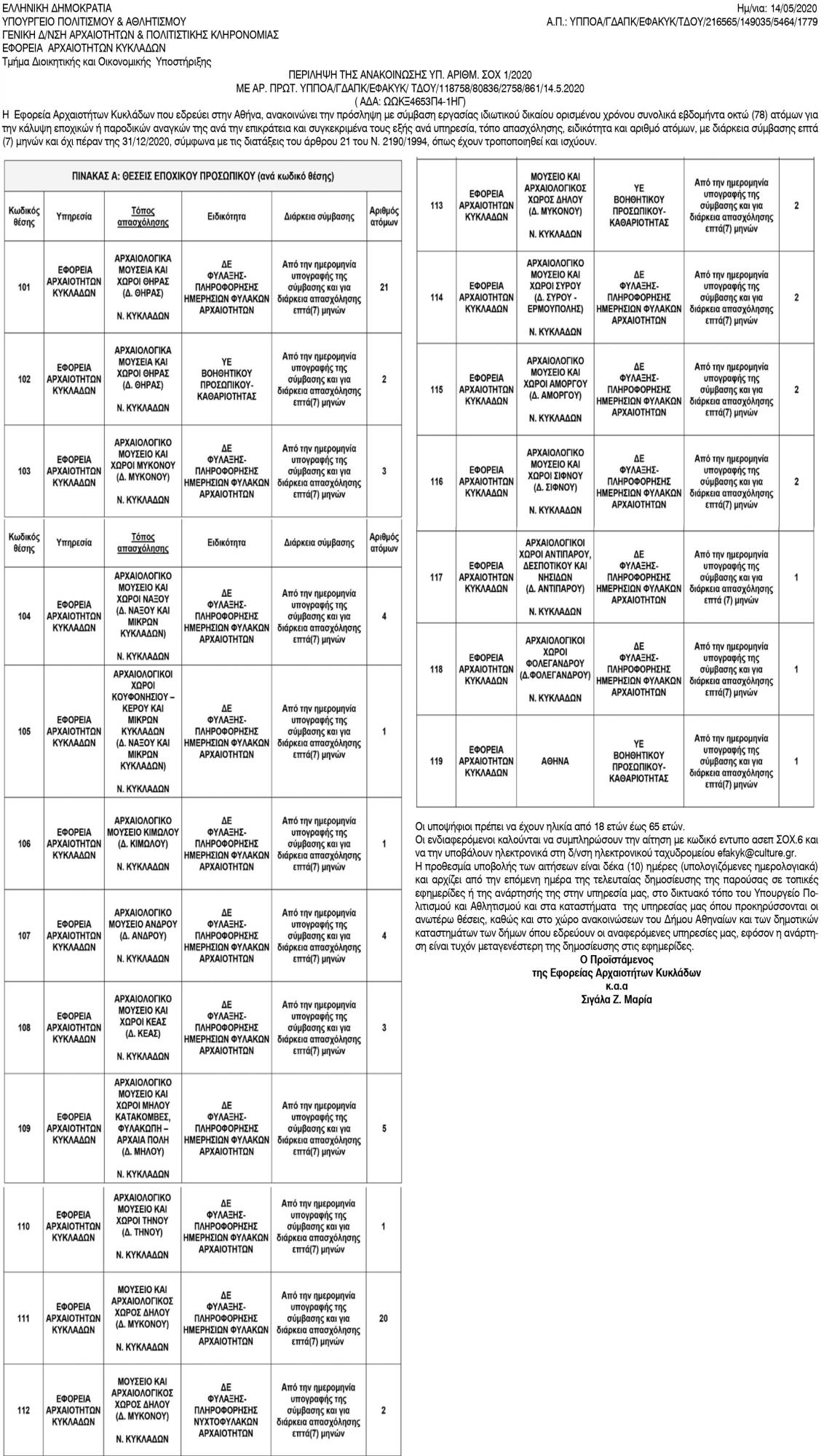 Περίληψη της ανακοίνωσης υπ' αριθμ. ΣΟΧ 1/2020 της Εφορείας Αρχαιοτήτων Κυκλάδων Κείμενο Βλέπε εικόνα Αριθμός Φύλλου: Αριθμός Φύλλου 5372 Κατηγορία: Κατηγορία Προκήρυξη Θέσεων