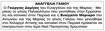 Αναγγελία Γάμου Γεωργίου Δαμίγου και Ευαγγελίας Μαριώρα Κείμενο Βλέπε εικόνα Αριθμός Φύλλου: 5373 Κατηγορία: Αναγγελία Γάμου