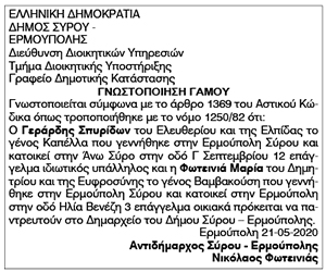 Γνωστοποίηση γάμου Γεράρδη Σπυρίδωνα και Φωτεινιά Μαρίας Κείμενο Βλέπε εικόνα Αριθμός Φύλλου: 5382 Κατηγορία: Γνωστοποίηση Γάμου