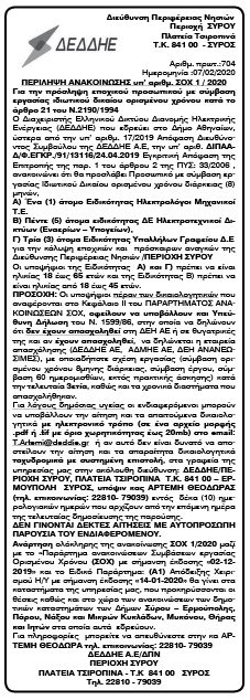 Περίληψη ανακοίνωσης υπ' αριθμ. ΣΟΧ 1/2020 της ΔΕΔΔΗΕ Κείμενο Βλέπε εικόνα Αριθμός Φύλλου: 5382 Κατηγορία: Προκήρυξη Θέσεων